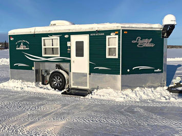 We also have this 2024 Ice Castle Trophy Hunter fish house. It's 8' x 17' and very similar inside to our green house with 6 holes, a dinette, indoor bathroom, and bunks to sleep 4 adults. It comes equipped with a generator, satellite TV, oven, microwave, cooktop stove, and Vexilar included. The ice road will be plowed and the holes will be drilled when you arrive. We do our best to stay on the fish!